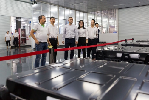 帖木爾.阿魯秋諾夫一行到達公司后就興沖沖地深入生產現場,在董事局主席魯小均,集團副總裁蔡申、新能源公司總經理呂軍煥,和總工辦李銀春博士、劉平宙、朱建錦等工程技術人員陪同下,先后參觀了鋰電池車間、新能源電機車間、智能電動渦旋壓縮機等車間,當看到一條條整齊的生產流水線和先進的自動化檢測裝備時,客人們不由得一邊拍照留影,一邊向陪同人員了解生產技術情況。